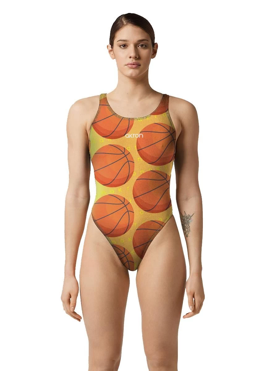 The swimsuit features a basketball themed print that will ensure you stand out at your next session at the pool.