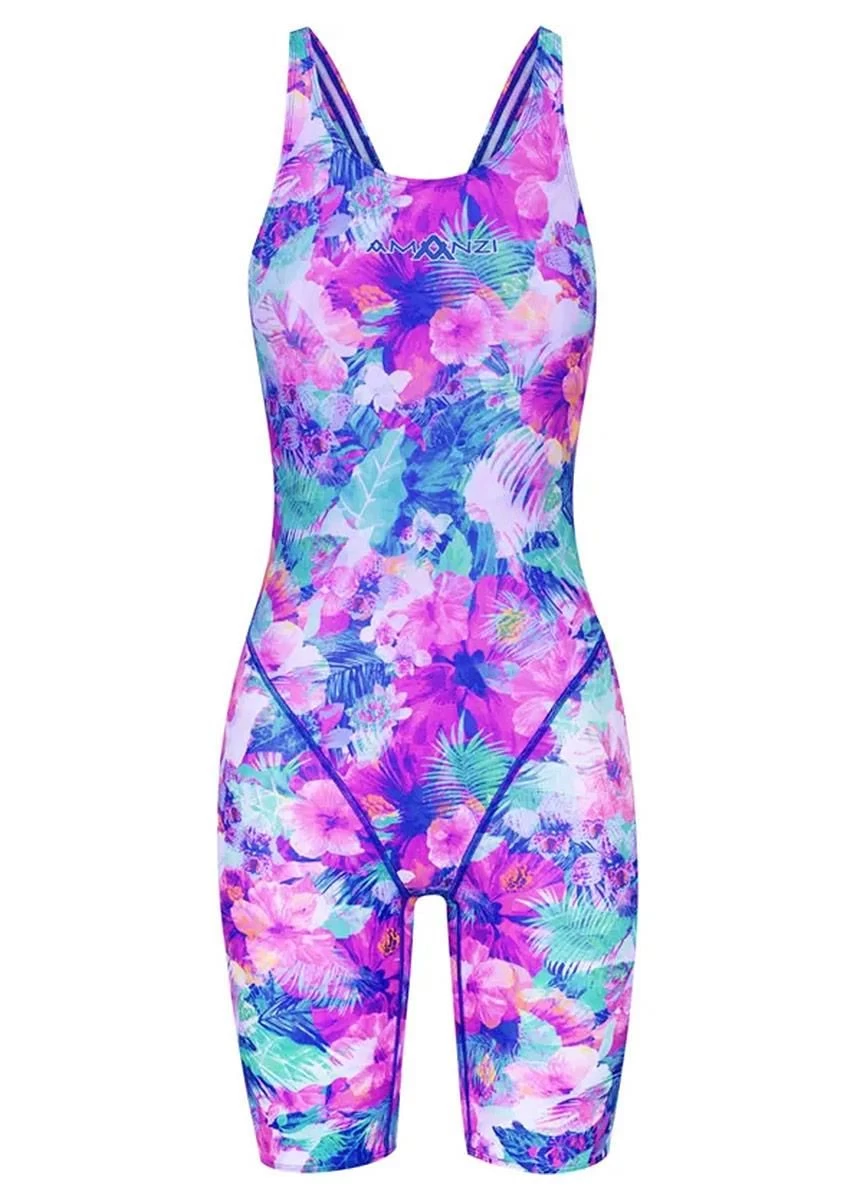 The Wild Blooms Kneelength swimsuit is an entry level racing swimsuit that is also suitable for training. The kneelength has been engineered to fit the needs of competitive and active swimmers, as well as triathletes and open water swimmers. The wide shoulder straps and back band are placed between the shoulder blades, allowing for maximum freedom and ease of movement whilst swimming. They also provide added bust support. The wide open back follows the natural contour of the body, providing an ergonomic fit and superior comfort.