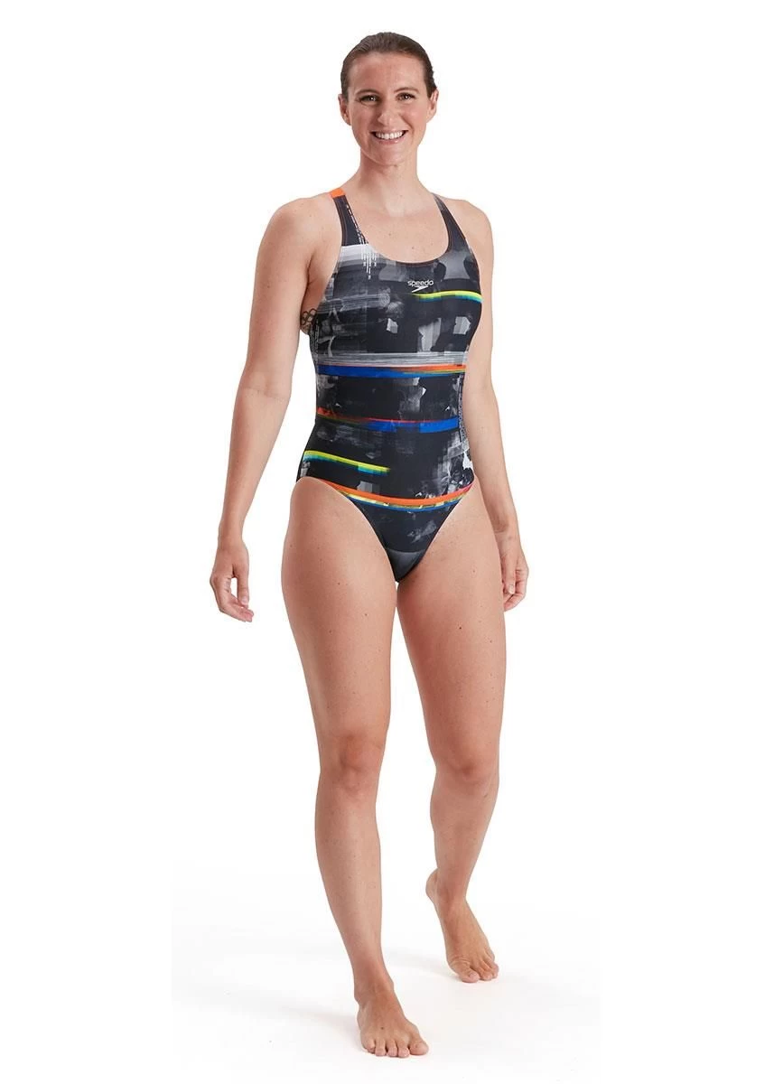 This Speedo Placement Digital Powerback swimsuit features a warped digital print with distorted, glitch-effect graphics and contrasting orange straps.