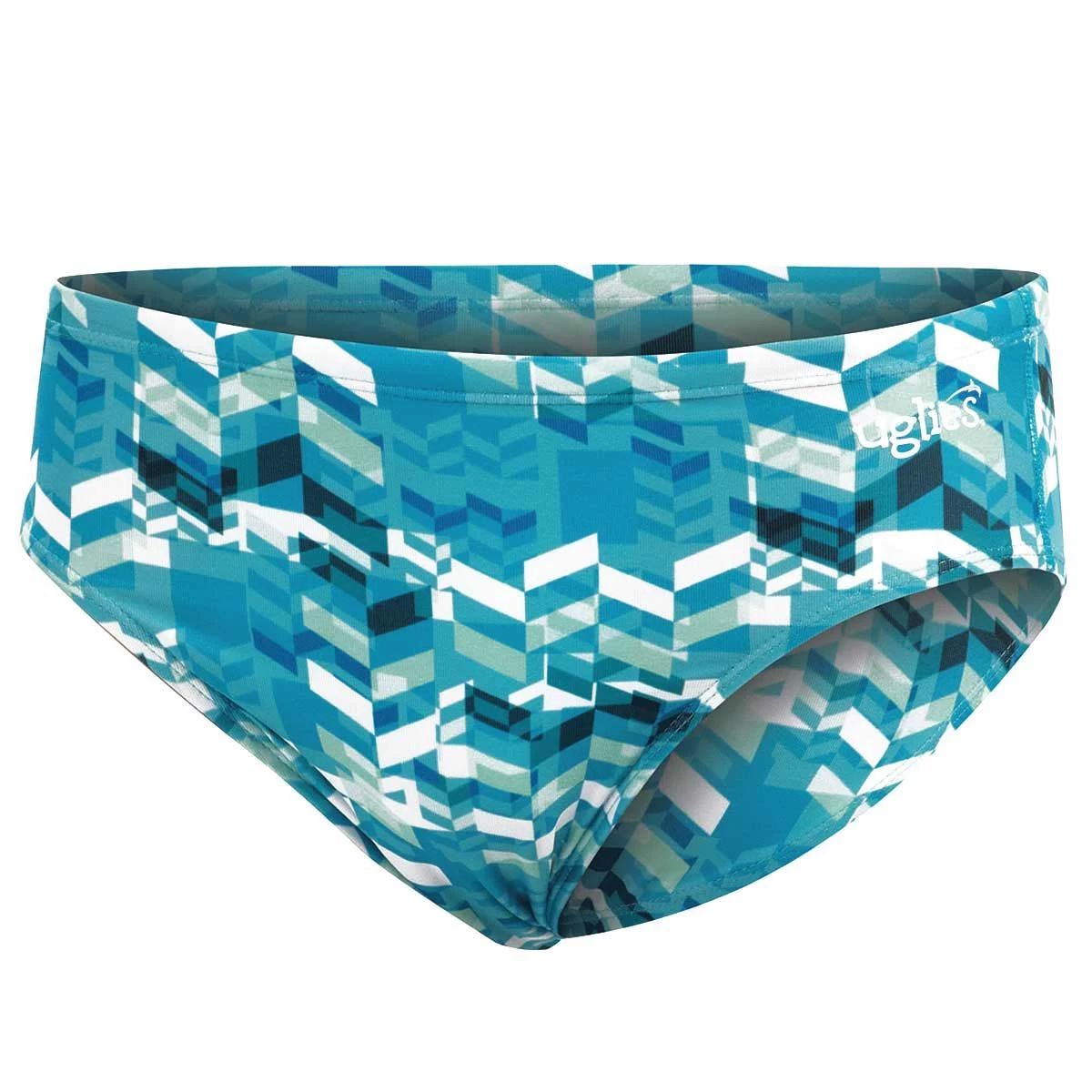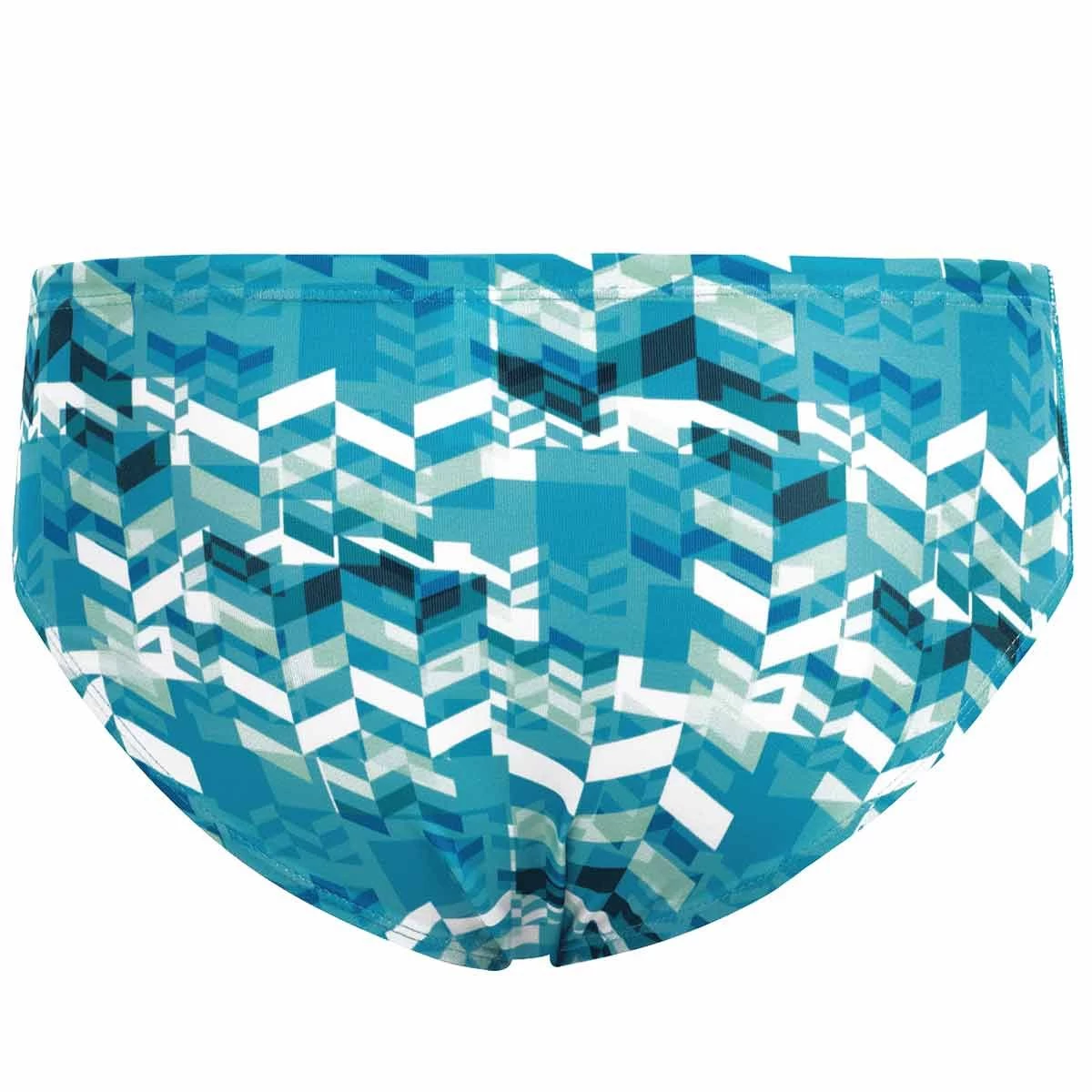 The men’s Pixel swimming briefs are a great choice for swim training and regular pool use. These Pixel briefs feature an eye-catching pattern of pixelated parallelograms in aqua-marine, white and shades of blue.