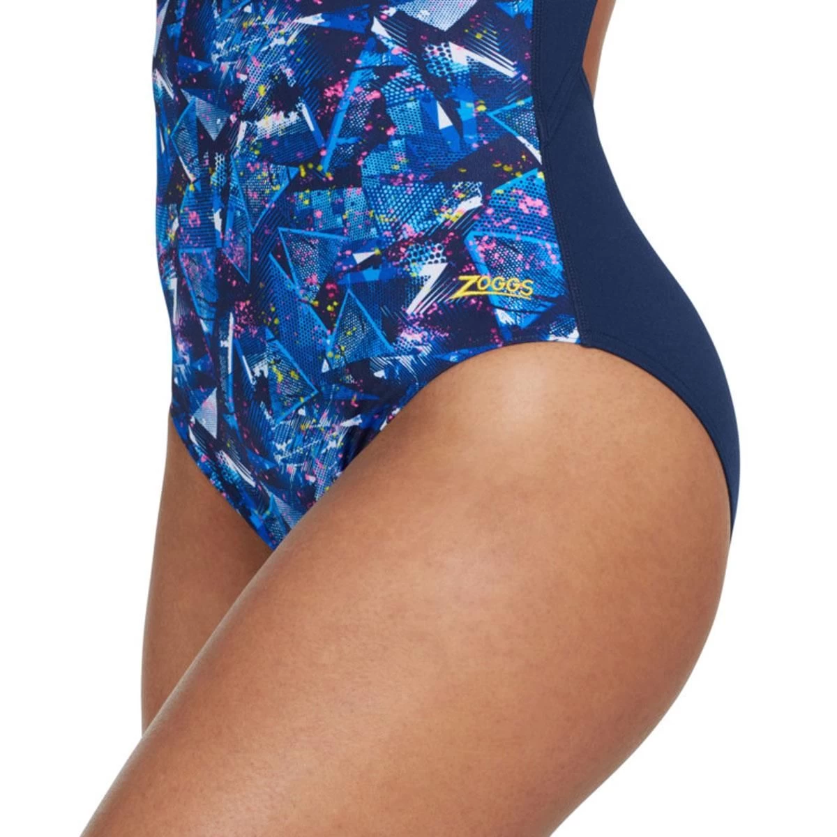 Power through the water in Zoggs new Catalyst print Actionback swimsuit. A blue and navy digital inspired print, this 100% chlorine proof, eco friendly swimsuit is sure to please. Wide straps and shelf bra ensure great support in the water and the open back provides freedom of movement when swimming. A classic design that also gives great bust support. Made with Zoggs Ecolast+ fabrication with yarn made from recycled plastic bottles. You won’t need to worry about anything other than beating your best lap time in this swimsuit.