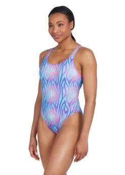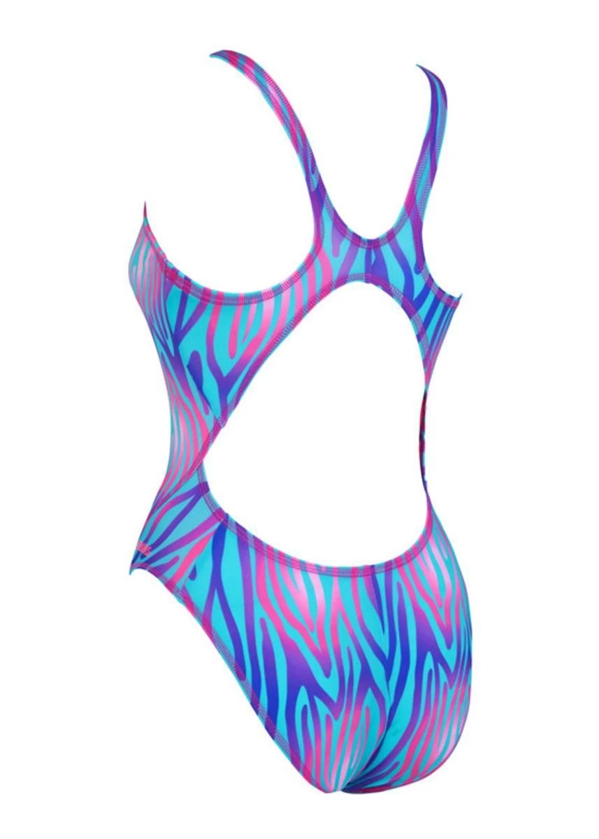 The Swim Crazy Masterback is a suit that is designed with a dedication to swimming faster and harder. A purple and blue twist on a tiger design. The open back and wider straps create a perfect combination of freedom of movement and support.