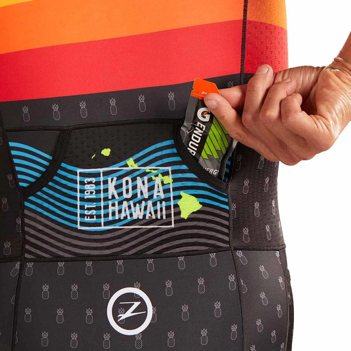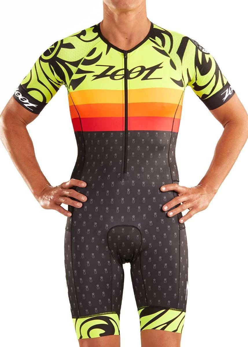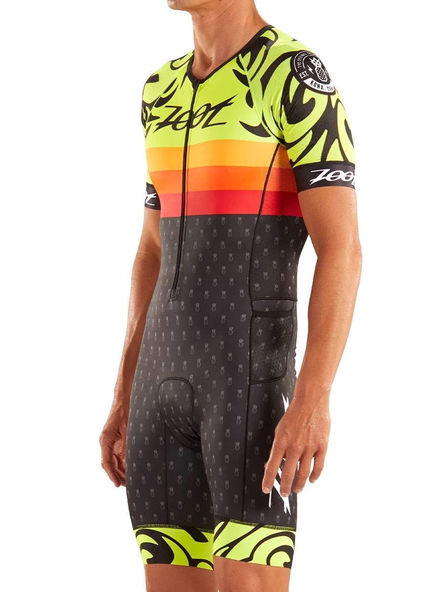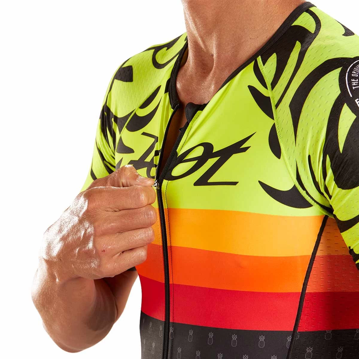 The Zoot Men’s Ali’i LTD Tri Aero Racesuit delivers maximum comfort on race day. The racesuit is aero-cut with textured sleeves to reduce surface tension and increase speed on the bike.