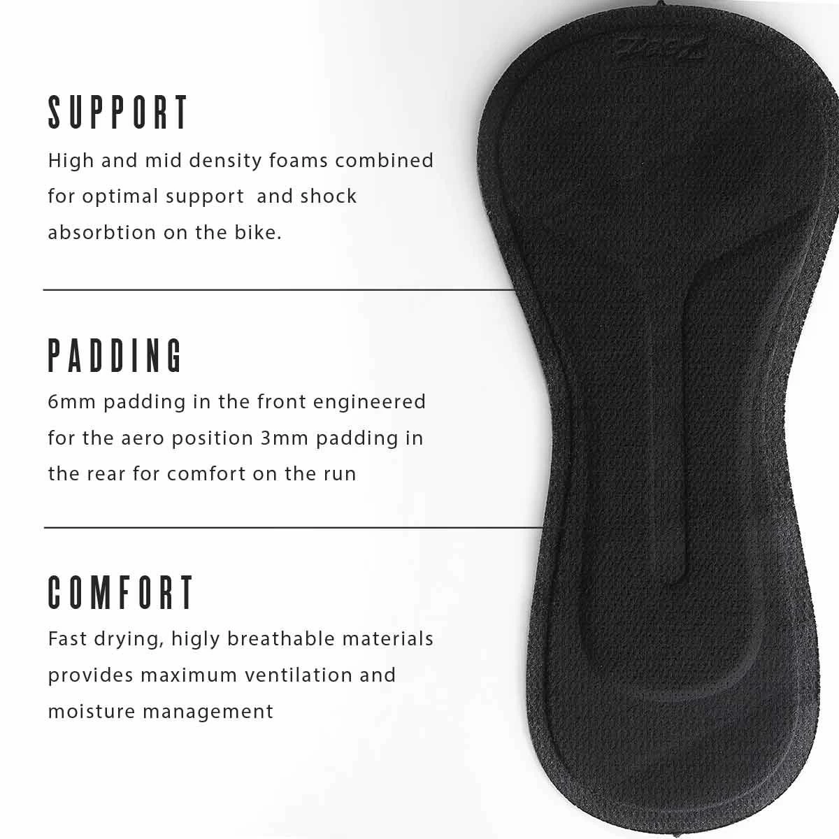 The new LTD TRI CHAMOIS is fast drying, highly breathable and is exclusively designed for ZOOT in Italy. It is engineered with mid density, low-water absorption foam for optimal support and shock absorption for the bike. Providing extreme comfort and a low profile on the run, while still providing the required cushioning for long distance racing.