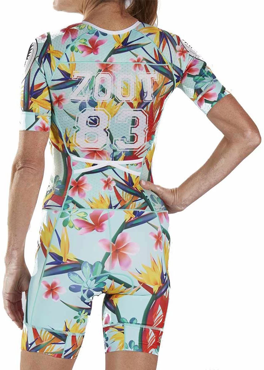 The Zoot Women’s 83 LTD Tri Aero Racesuit provides maximum comfort and freedom on race day. The racesuit is aero-cut with textured sleeves to reduce surface tension and increase speed on the bike. Â
